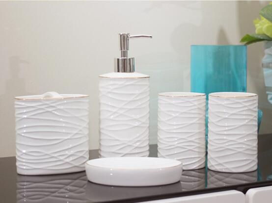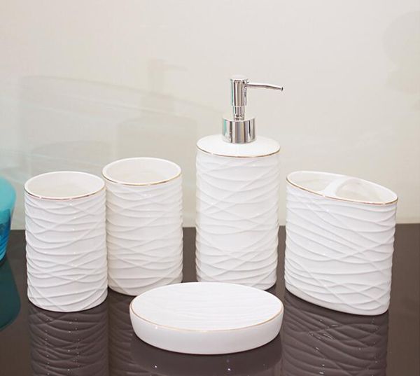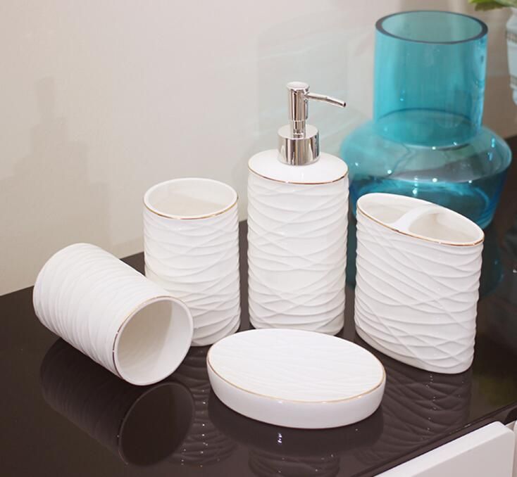 Grosshandel Weisse Farbe Keramik Bad Accessoires Elegant 5 Stuck Badezimmer Sets 1 Seifenflasche 1 Seifenschale 1 Zahnburstenhalter 2 Tassen Lh31